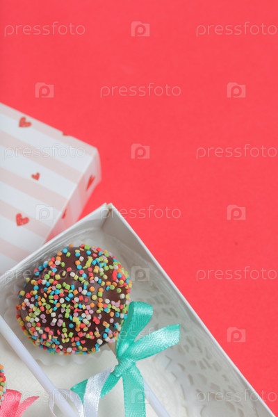 Кейк-попсы в шоколаде с цветной посыпкой. Украшен бантиком из ленты. Они лежат в подарочной коробке, в крышке которой имеется прозрачное окошко. На красном фоне