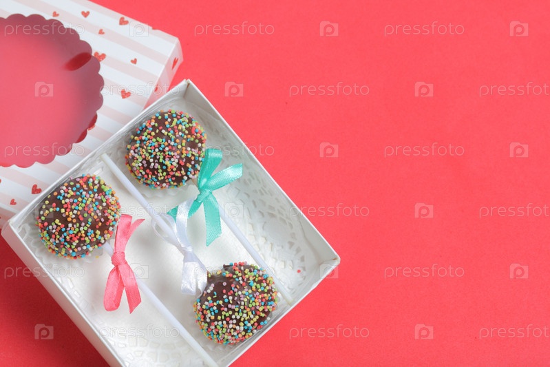 Кейк-попсы в шоколаде с цветной посыпкой. Украшен бантиком из ленты. Они лежат в подарочной коробке, в крышке которой имеется прозрачное окошко. На красном фоне