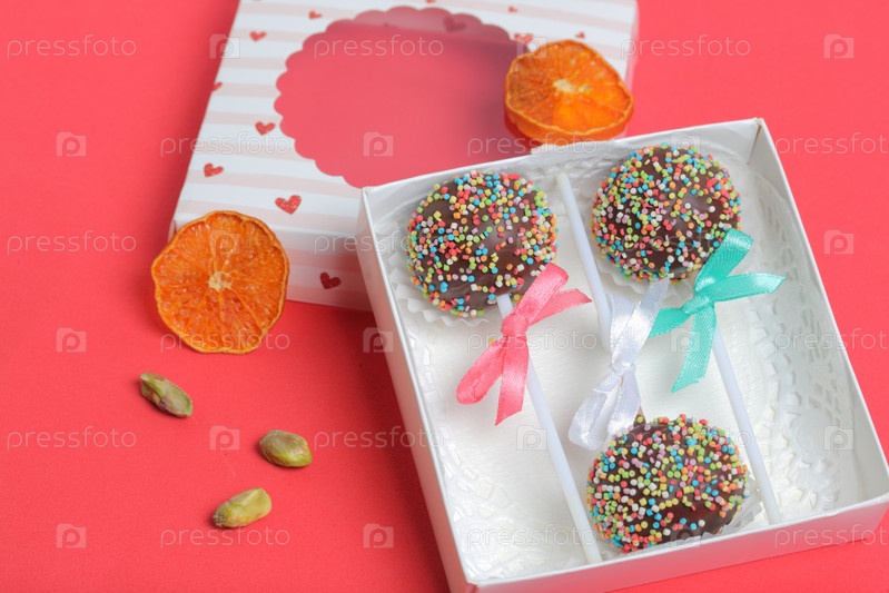 Кейк-попсы в шоколаде с цветной посыпкой. Украшен бантиком из ленты. Они лежат в подарочной коробке, в крышке которой имеется прозрачное окошко. Рядом лежат сухофрукты для украшения. На красном фоне
