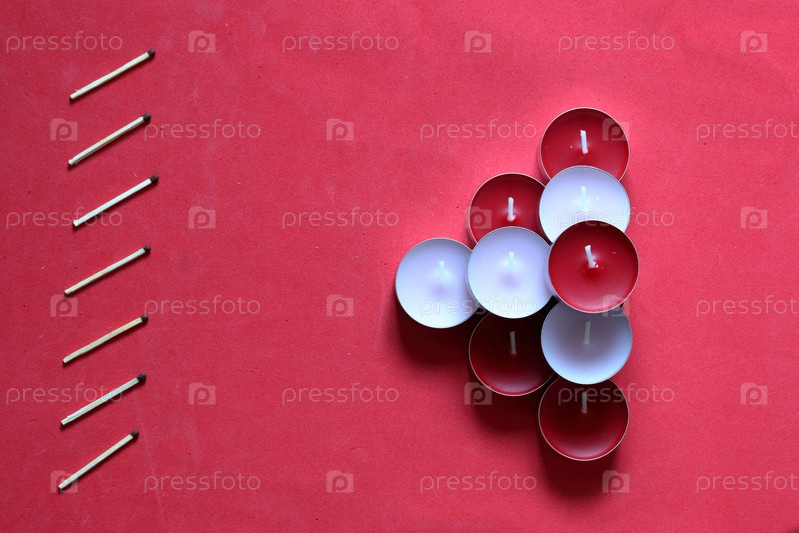 Декоративные свечи расположены в форме пирамиды. Матчи располагаются подряд. На розовом фоне
