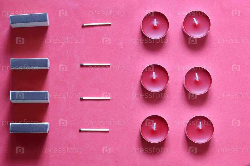 Декоративные свечи, спичечные коробки и спички расположены в ряд. На розовом фоне