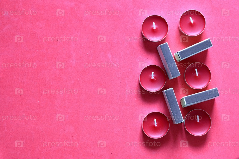 Декоративные свечи и спичечные коробки, расположенные в ряд. На розовом фоне