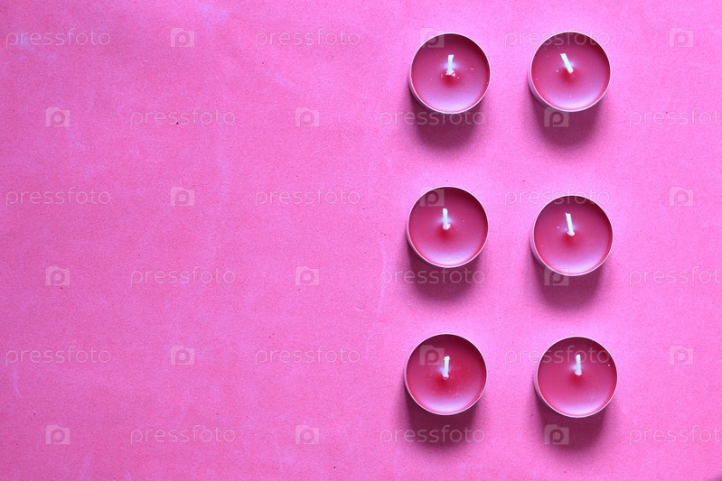 Декоративные свечи, расположенные в ряд. На розовом фоне