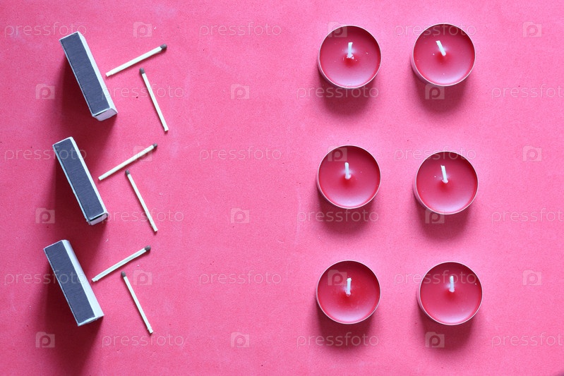 Декоративные свечи, спичечные коробки и спички расположены в ряд. На розовом фоне