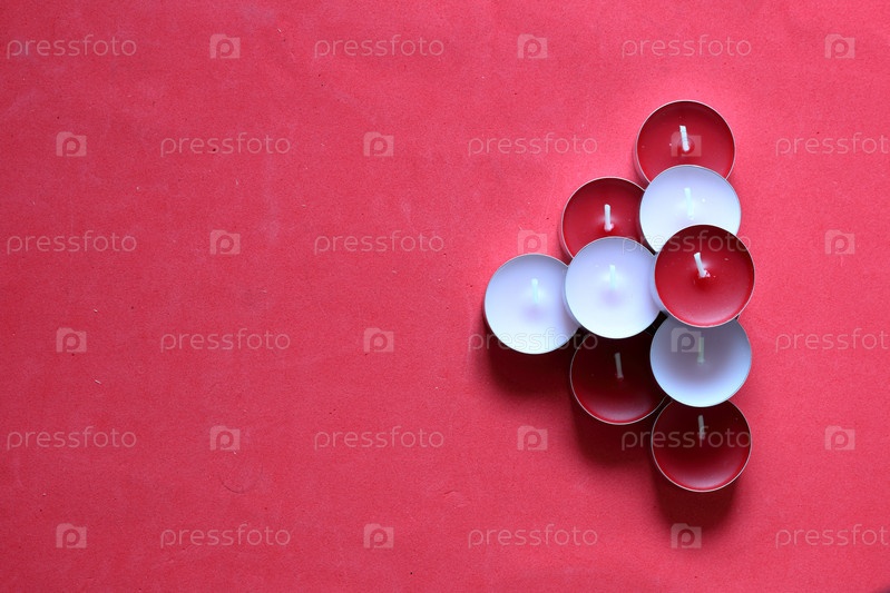 Декоративные свечи расположены в форме пирамиды. На розовом фоне