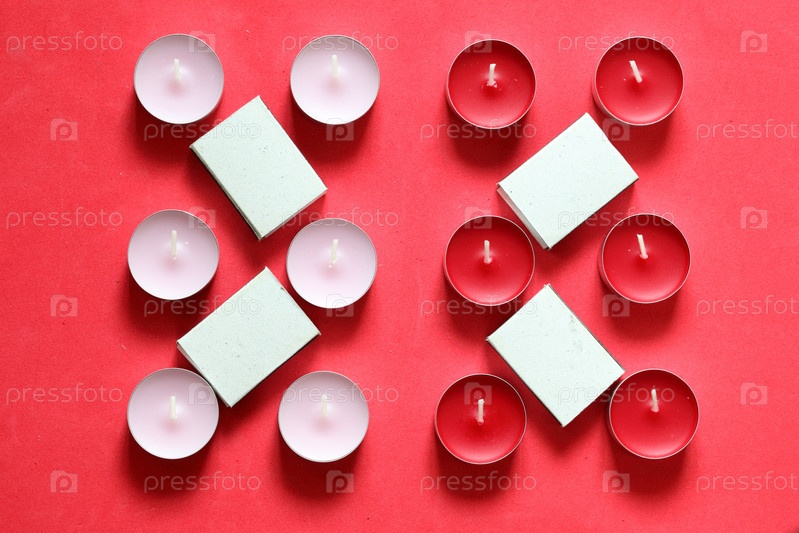 Декоративные свечи и спичечные коробки, расположенные в ряд. На розовом фоне