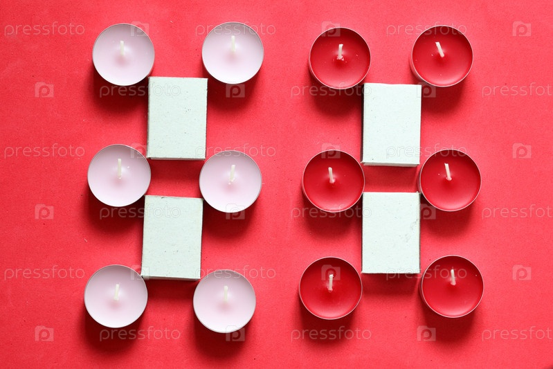 Декоративные свечи и спичечные коробки, расположенные в ряд. На розовом фоне