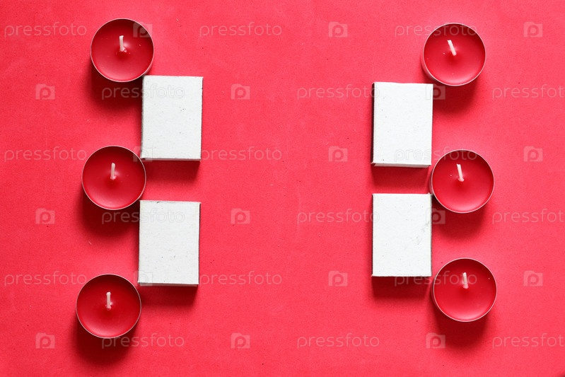 Декоративные свечи и спичечные коробки, расположенные в ряд. На розовом фоне