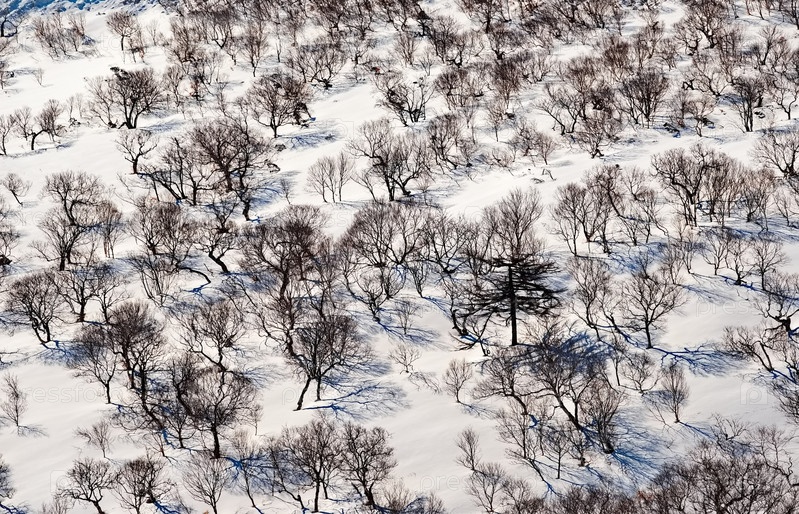 Россия. Дальний Восток, остров Итуруп. Контрастные заросли каменной березы с корявыми стволами на заснеженных склонах вулканов