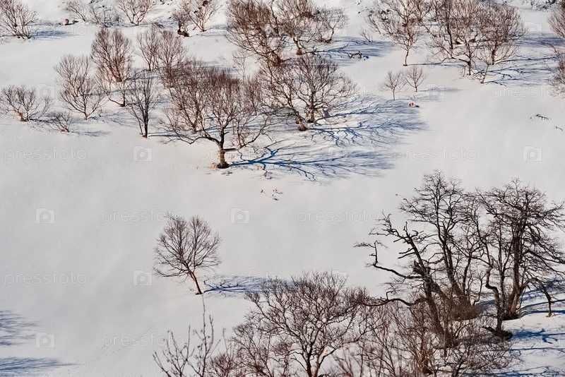 Россия. Дальний Восток, остров Итуруп. Контрастные заросли каменной березы с корявыми стволами на заснеженных склонах вулканов