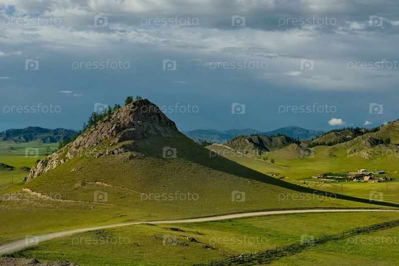 Россия. Юг Западной Сибири, Горный Алтай. Живописные святые горы, покрытые сплошным зеленым ковром с множеством альпийских цветов, недалеко от поселка Усть-Кан