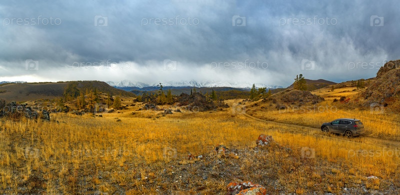 Россия. Юг Западной Сибири, горный Алтай. Начало осени на живописных скалистых местах в Курайской степи вдоль Чуйского тракта