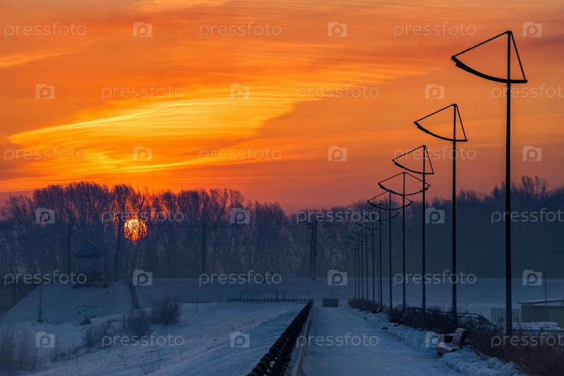 Новокузнецк, Россия. Юг Западной Сибири. Восходящее солнце над фонарями набережного парка города Новокузнецка