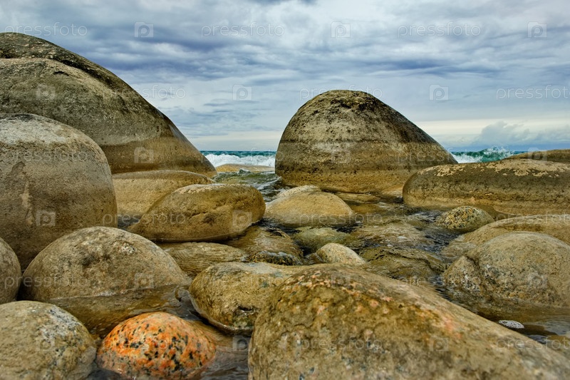 Северный Кыргызстан. Пейзаж холодного озера Иссык-Куль с цветными округлыми камнями различного размера вдоль живописного берега