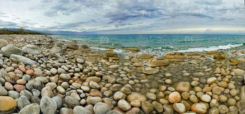 Северный Кыргызстан. Пейзаж холодного озера Иссык-Куль с цветными округлыми камнями различного размера вдоль живописного берега