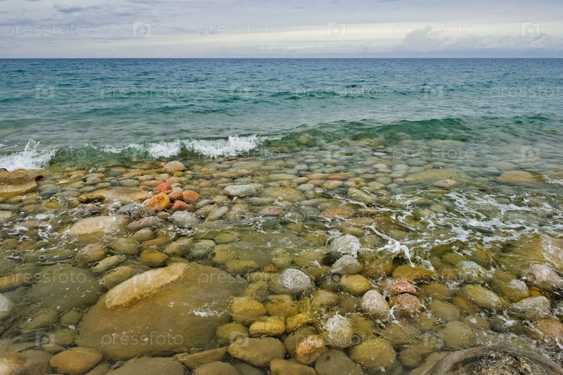 Северный Кыргызстан. Пейзаж холодного озера Иссык-Куль с цветными округлыми камнями различного размера вдоль живописного берега