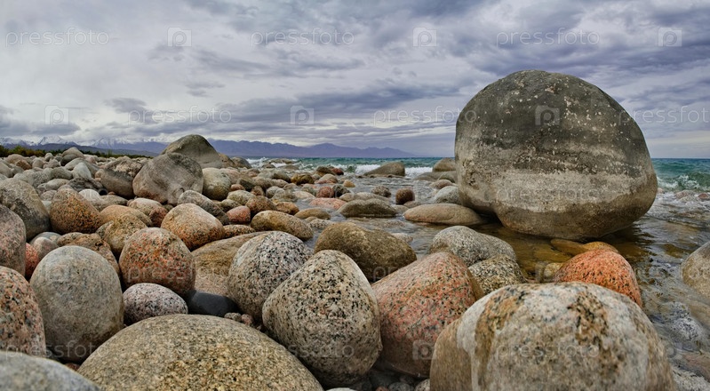 Северный Кыргызстан. Пейзаж холодного озера Иссык-Куль с цветными округлыми камнями различного размера вдоль живописного берега
