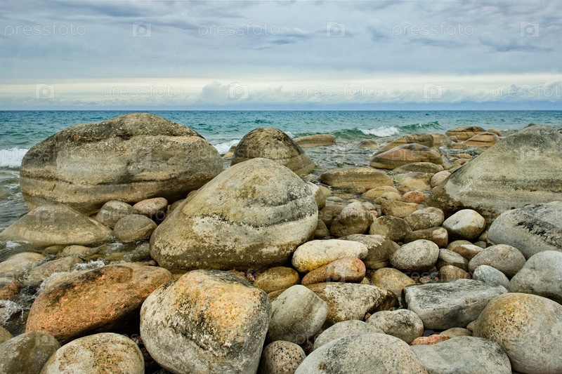 Северный Кыргызстан. Пейзаж холодного озера Иссык-Куль с цветными округлыми камнями различного размера вдоль живописного берега