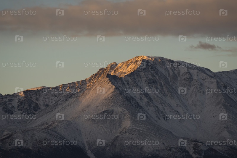 Россия. Юг Западной Сибири, горный Алтай. Освещенные багровым утренним светом вершины Северо-Чуйского хребта вдоль Чуйского тракта