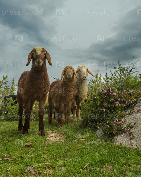 Северный Кыргызстан. Отара породистых овец пасется среди кустарников на берегу озера Иссык-Куль