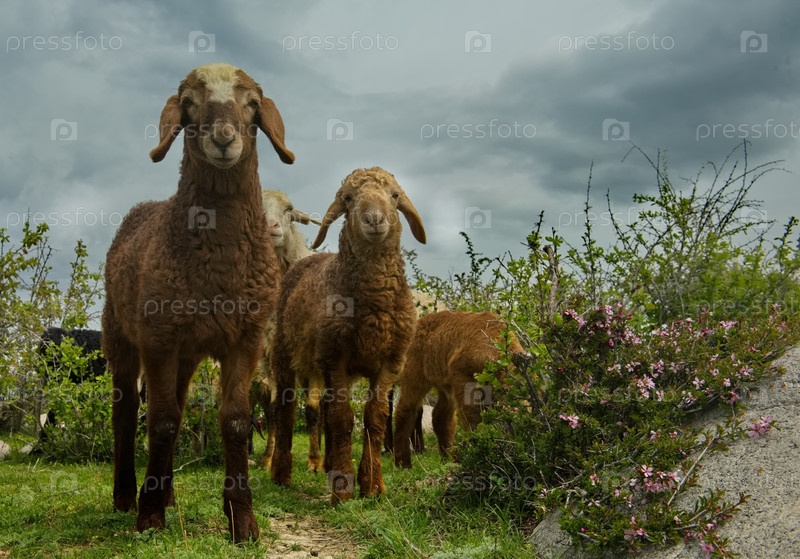Северный Кыргызстан. Отара породистых овец пасется среди кустарников на берегу озера Иссык-Куль