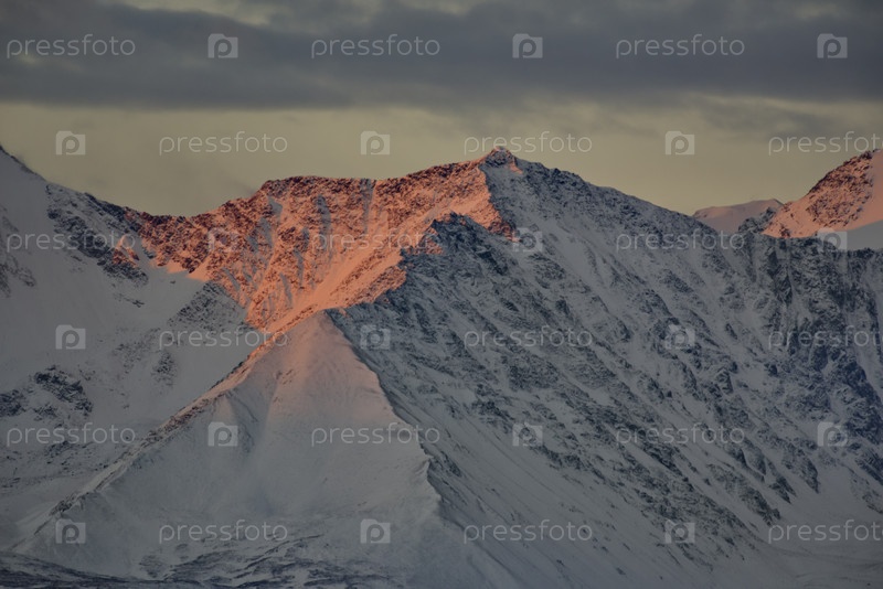 Россия. Юг Западной Сибири, горный Алтай. Освещенные багровым утренним светом вершины Северо-Чуйского хребта вдоль Чуйского тракта
