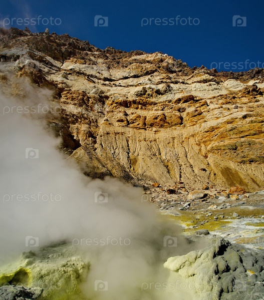 Россия. Полуостров Камчатка. Вулкан Мутновская Сопка уникален тем, что из кратера вулкана вытекает река, на берегах которой много дымящихся и бурлящих фумарол