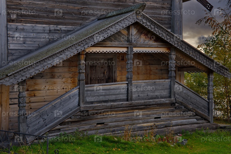 Россия, Карелия. Архитектура старинных бревенчатых крестьянских домов на берегу Онежского озера