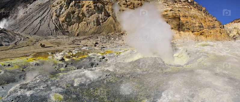 Россия. Полуостров Камчатка. Вулкан Мутновская Сопка уникален тем, что из кратера вулкана вытекает река, на берегах которой много дымящихся и бурлящих фумарол