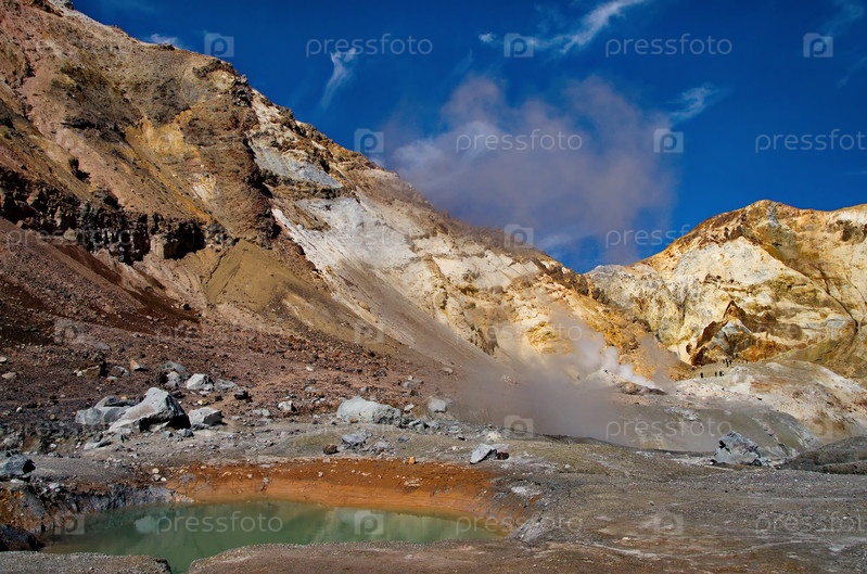 Россия. Полуостров Камчатка. Вулкан Мутновская Сопка уникален тем, что из кратера вулкана вытекает река, на берегах которой много дымящихся и бурлящих фумарол