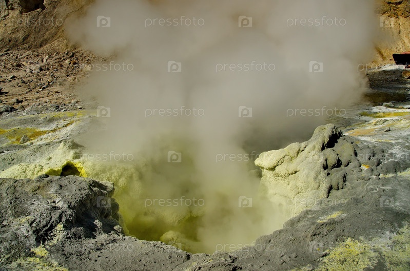 Россия. Полуостров Камчатка. Вулкан Мутновская Сопка уникален тем, что из кратера вулкана вытекает река, на берегах которой много дымящихся и бурлящих фумарол
