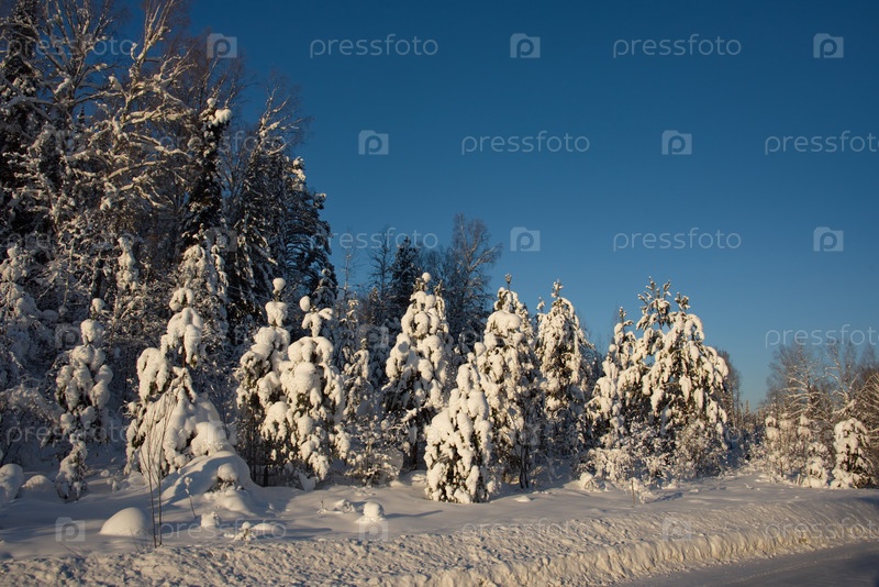 Россия, Горный Алтай. Заснеженные пихты в лучах закатного зимнего солнца