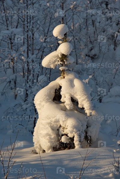 Россия, Горный Алтай. Заснеженные пихты в лучах закатного зимнего солнца