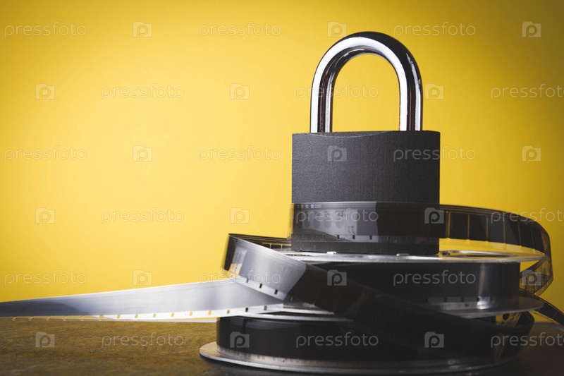 Запрет на показ фильмов. Запретный фильм. Крытый кинотеатр. Катушка с пленкой и замок