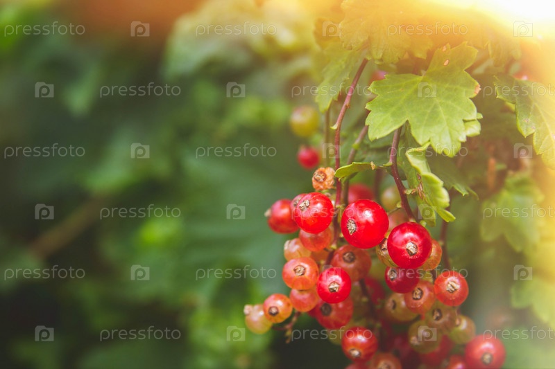 Красная смородина в лучах яркого солнца. Спелые ягоды, выращенные без ГМО