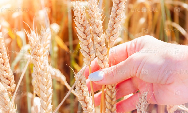 Агроном проверяет качество початков. Рука и пшеница. Поле, засеянное рожью