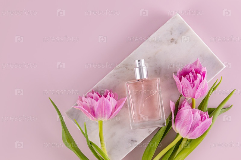 Элегантный флакон парфюмированной воды или женских духов лежит на мраморном прямоугольном подиуме с тюльпанами. Презентация аромата. Вид сверху