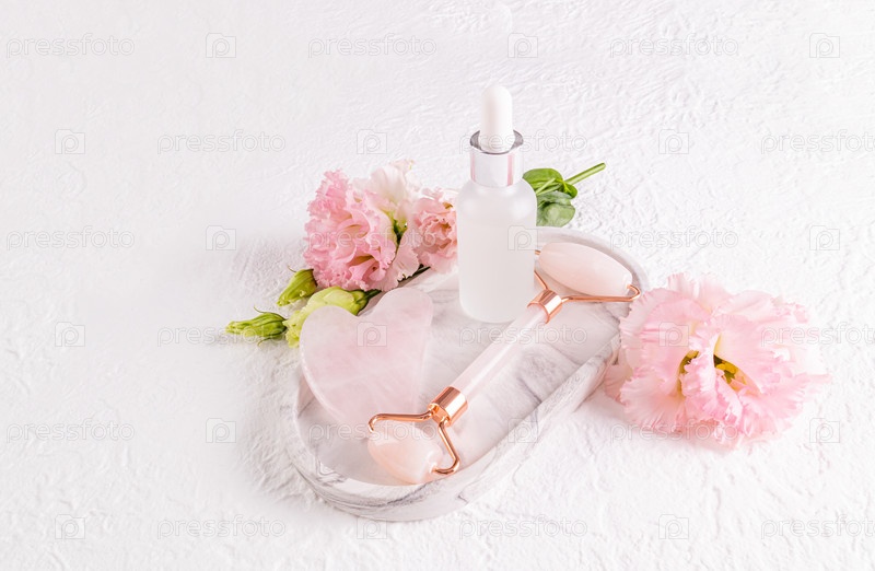 Роликовый массажер из розового кварца, скребок гуаша, масло для массажа и ухода в матовом флаконе на белом керамическом подносе. Вид сверху. Лифтинг-эффект
