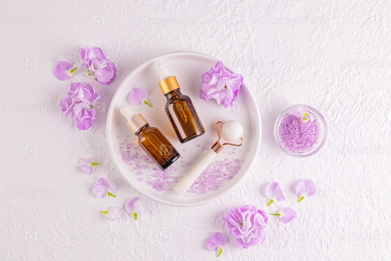 Две бутылки-капельницы с натуральным средством по уходу за кожей, маслом для массажа, каменным роликовым массажером на белом круглом подносе среди цветов. Вид сверху