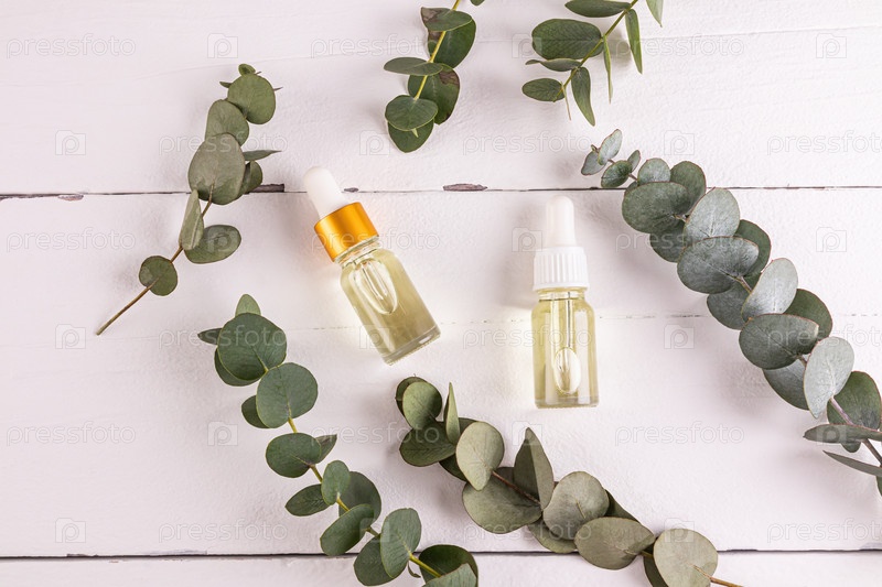 Два легких стеклянных косметических флакона с натуральным эвкалиптовым маслом для ухода за кожей лица. омоложение, регенерация клеток. вид сверху. эвкалиптовые ветки