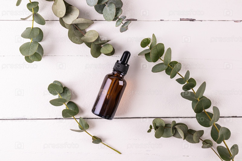 Косметический флакон с сывороткой на основе эвкалиптового масла для ухода за антивозрастной кожей лица. натуральная косметика. белый деревянный фон