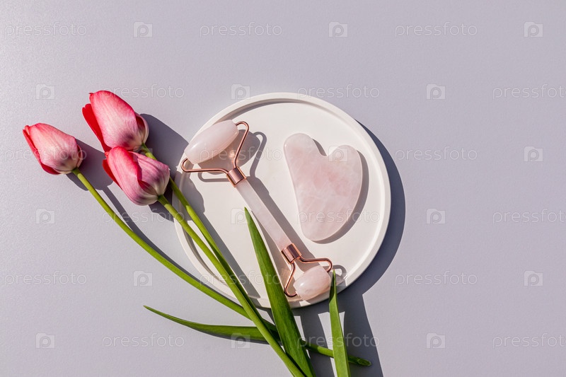 Роликовый массажер и скребок из розового кварца на круглом керамическом подносе с живыми тюльпанами. вид сверху. серый фон. Естественный уход