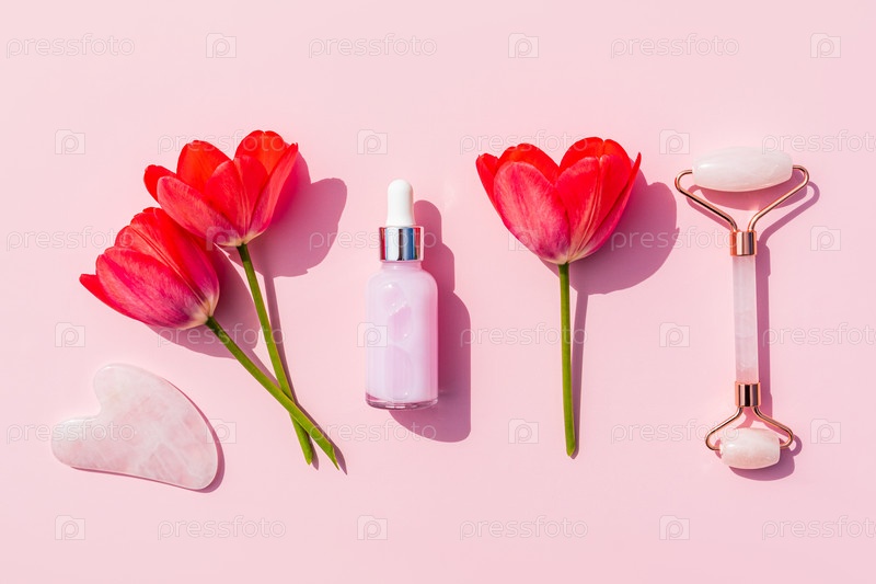 Косметический набор для домашнего массажа и ухода за кожей лица и шеи. кварцевый массажер, гуаша, натуральное масло на розовом фоне с цветами. Плоская планировка