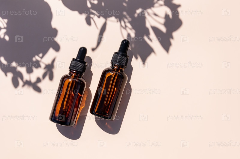 Две косметические бутылки с увлажняющей сывороткой для увлажнения кожи лица на бежевом фоне и солнечном свете. Копировальное пространство. Пустая бутылка лежала