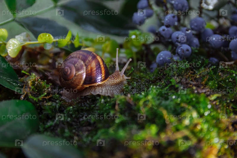 Большая коричневая улитка ползет к падубу магонии и чернике по зеленому мху в лесу крупным планом с размытым фоном и мягким избирательным фокусом, концепцией садоводства и вредителей, макрокосмом в лесу