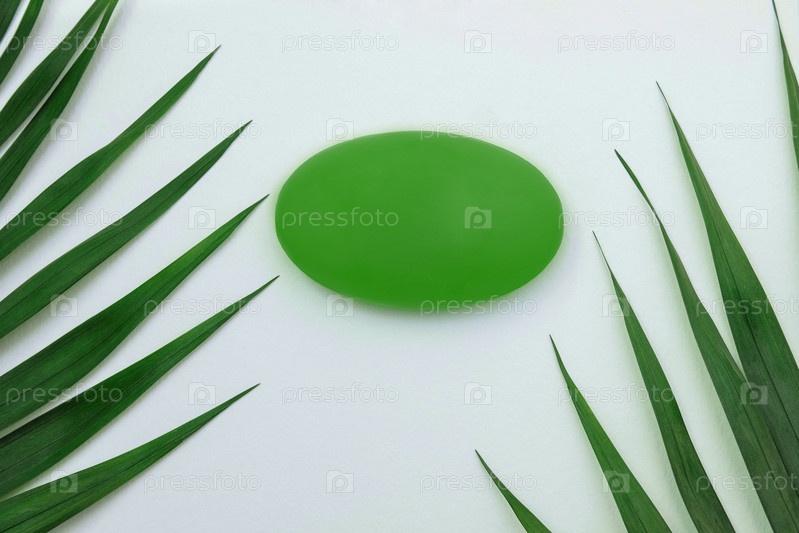 Мыло на белом фоне с зелеными пальмовыми листьями крупный план с пустым местом для текста, концепция рекламного шаблона, дизайн продукта, средства личной гигиены, pH и уход за кожей, органическая и натуральная косметика