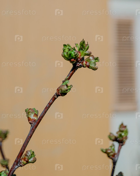 Ветки молодого саженца вишни ДЮК Ночка ранней весной, начало распускания почек