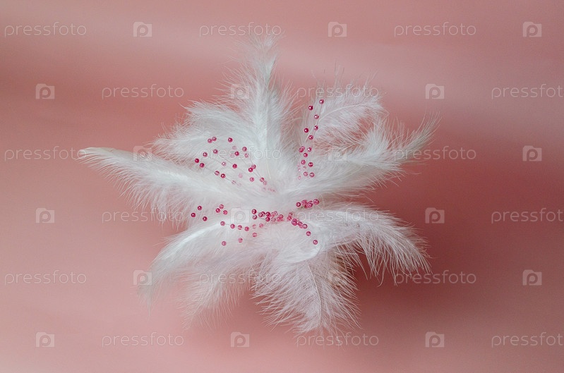 Искусственный нежный цветок, мини букет, декор из белых пушистых птичьих перьев и веточек с розовыми круглыми бусинами, на нежно-розовом фоне