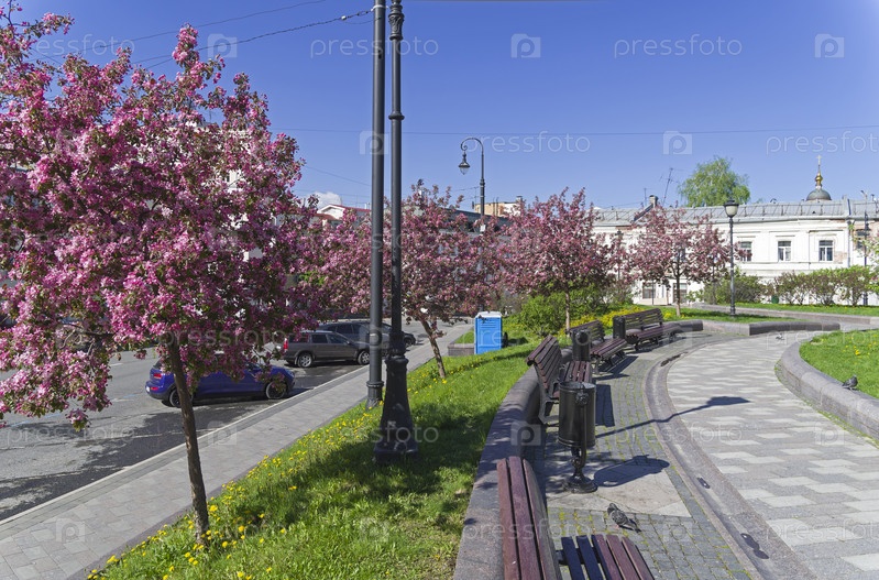 Цветущие яблони на Хитровской площади. Москва, Россия, солнечный день в мае