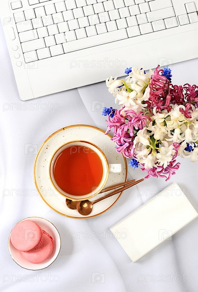 Современный женский стол, домашний офис. Компьютер, цветы гиацинта и чашка чая, миндальное печенье на солнечном столе с длинными тенями, концепция образа жизни, удобная работа на дому, шаблон для дизайна, плоская планировка,